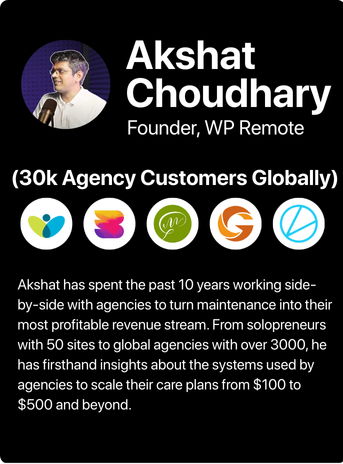 Akshat has spent the past 10 years working side-by-side with agencies to turn maintenance into their most profitable revenue stream. From solopreneurs with 50 sites to global agencies with over 3000, he has firsthand insights about the systems used by agencies to scale their care plans from $100 to $500 and beyond.